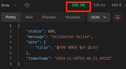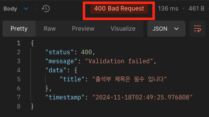 위의 DTO 에서 title 을 NotEmpty 로 검증했는데 빈 값을 보내면 어떻게 되는지 확인해 봅시다.