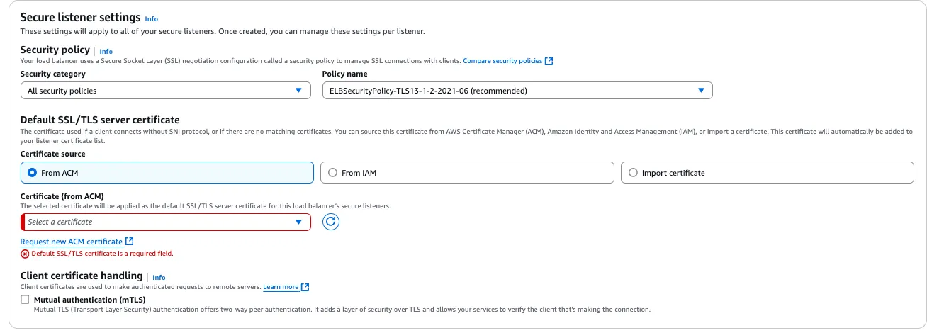ALB 설정할 때 인증서로 ACM 을 선택했는데 ALB 에 도메인을 달아주지 않았기 때문입니다.