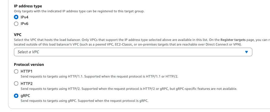 gRPC는 HTTP2 기반이기 때문에 HTTP2 를 선택해도 되지만 AWS 의 설명 처럼 일부 기능을 사용할 수 없다고 합니다.