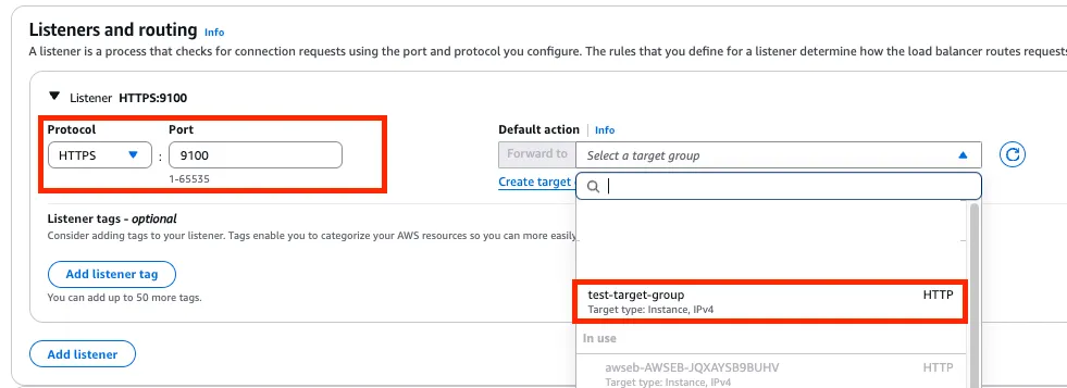 ALB의 9100 PORT 로 들어오는 요청을 앞에서 생성한 Target Group 으로 전달해 주자 !