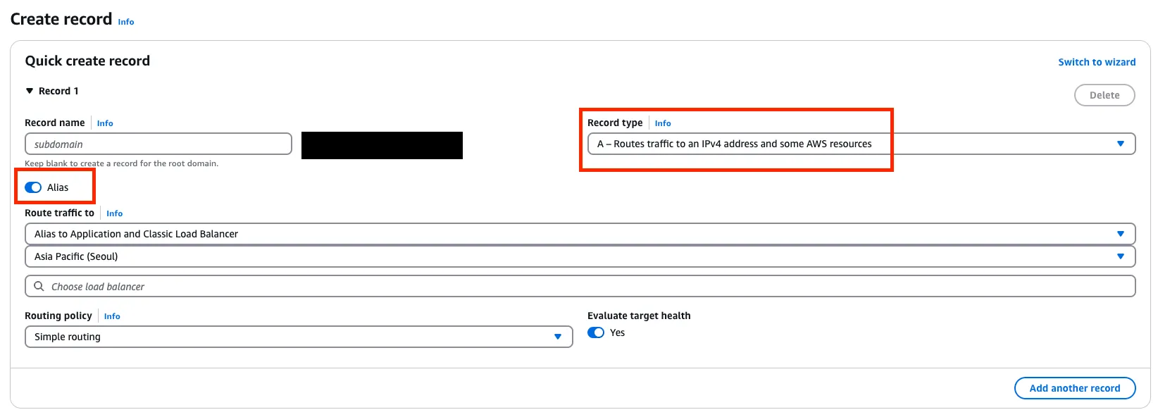 여기서 Alias to Application and Classic Load Balancer 를 선택한 후 생성한 ALB 를 선택해 줍니다.