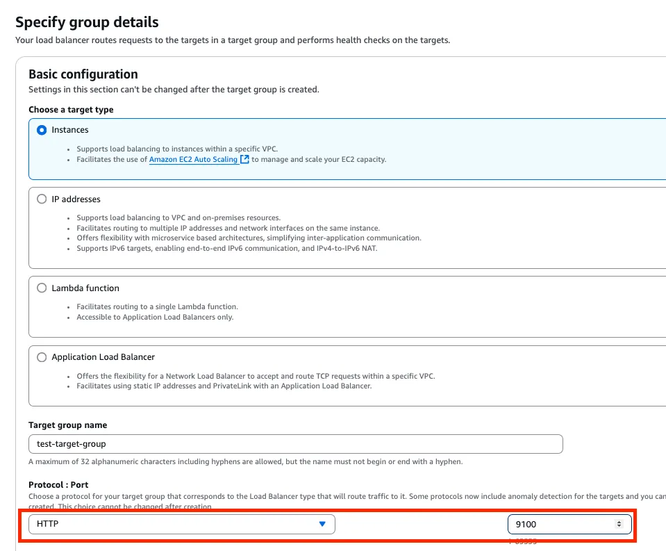 Port 는 Target Group 의 9100 port 를 그대로 사용할 예정이니 Traffic Port 로 선택해 주자.