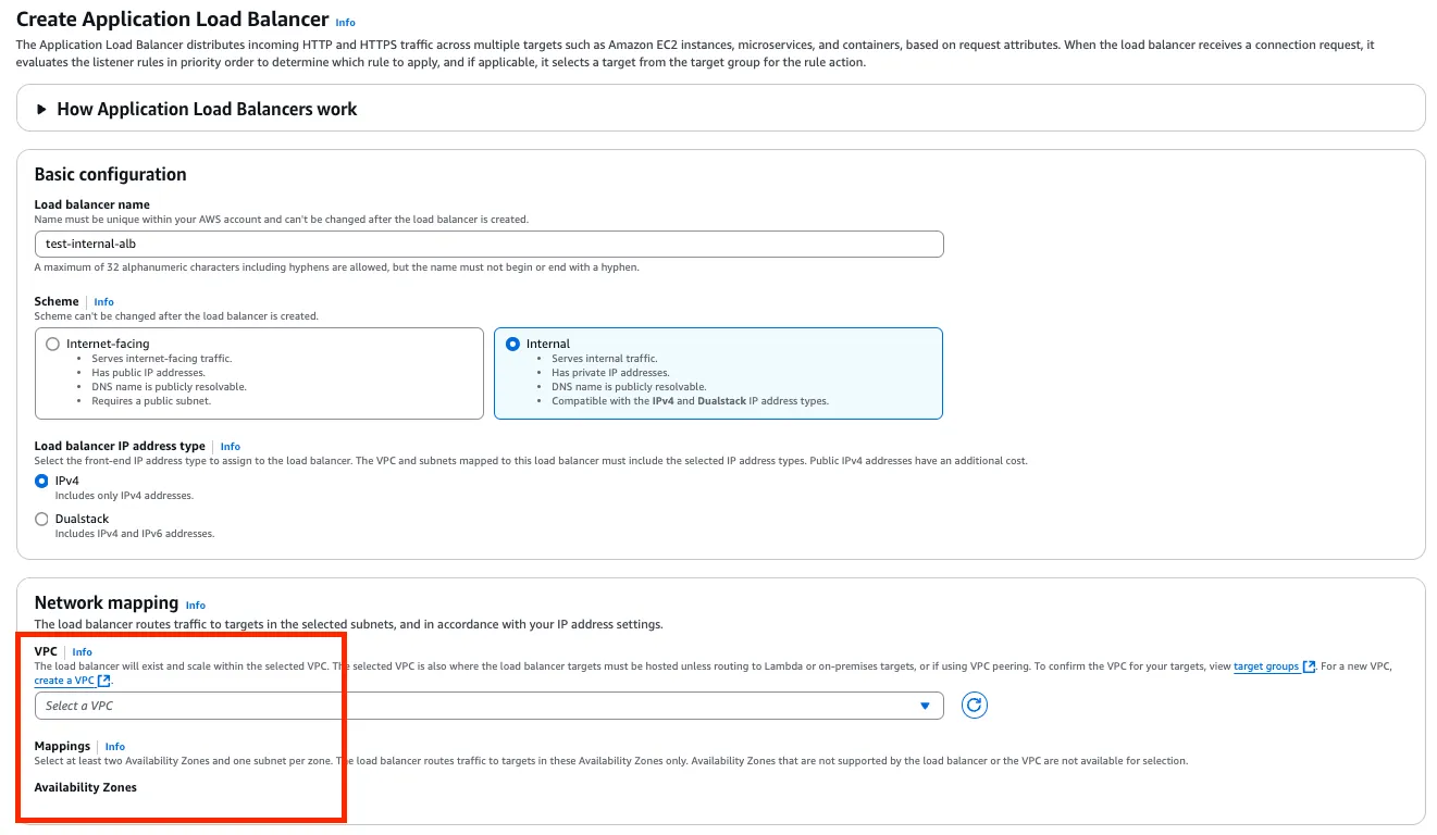 Scheme: 저는 내부 서버 간 통신을 위한 ALB 이므로 Internal 로 선택