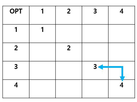 그러므로 우리는 opt와 dp의 탐색 방향을 아래의 표와 같이 가기 원하는 것이다.
