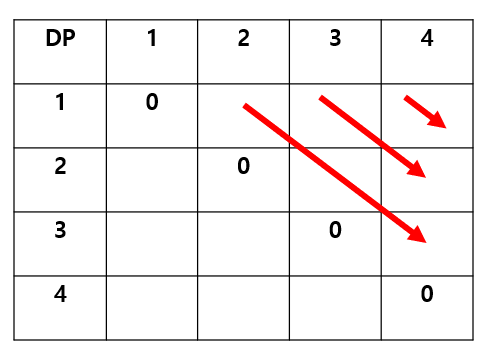 opt[3][4]를 구하기 위해서는 opt[3][3] 과 opt[4][4]를 알아야한다.