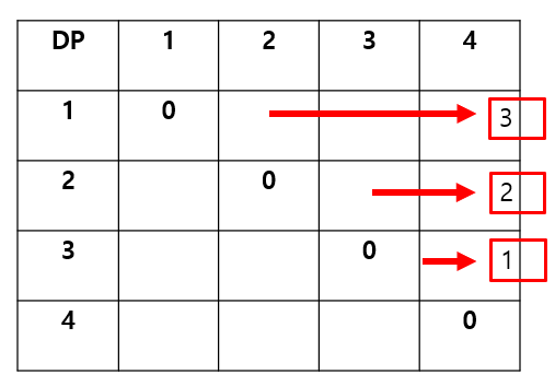 opt[3][4]를 구하기 위해서는 opt[3][3] 과 opt[4][4]를 알아야한다.