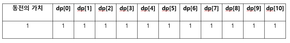 동전의 가치가 1인 경우 DP는 위의 표와 같다. 위의 표는 동전의 가치가 1인 동전만을 사용해 k원을 만든 것이다.