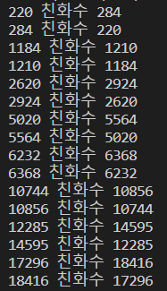 print(f"{j} 친화수 {i}" )