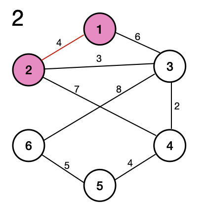 이때 선택 가능한 경로는 2번 노드로 가는 코스트 4 인 경로 또는 3번 노드로 가는 코스트 6인 노드가 있다.