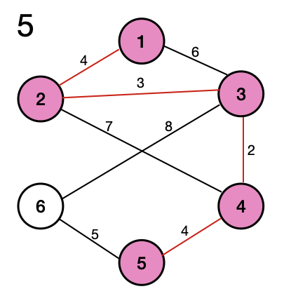 그러므로 다음 상태에서는 코스트가 4인 5번 노드를 방문하게 된다.