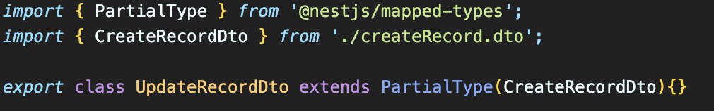 이제 UpdateRecordDto는 CreateRecordDto와 같은 속성 값을 가지지만 일부 속성만을 가지는 class이다.