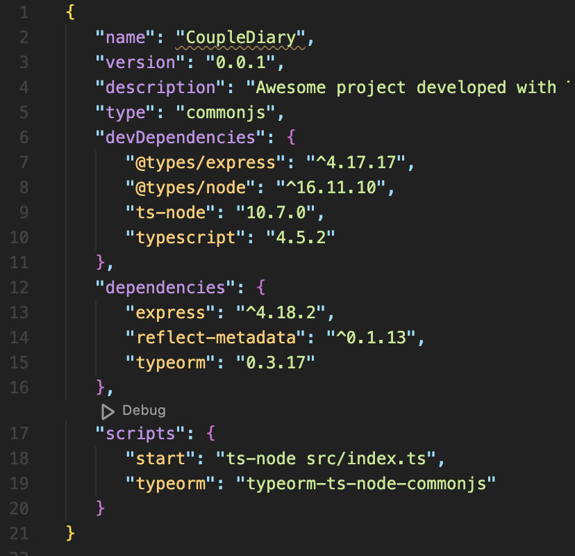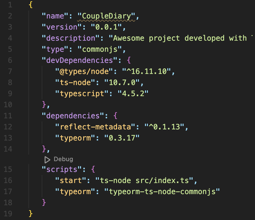 생성된 pakage.json file 안에 이미 typescript 모듈과 node에서 typescript를 사용하기 위해 필요한 @types/node와 ts-node가 설치되어 있음을 확인할 수 있다.