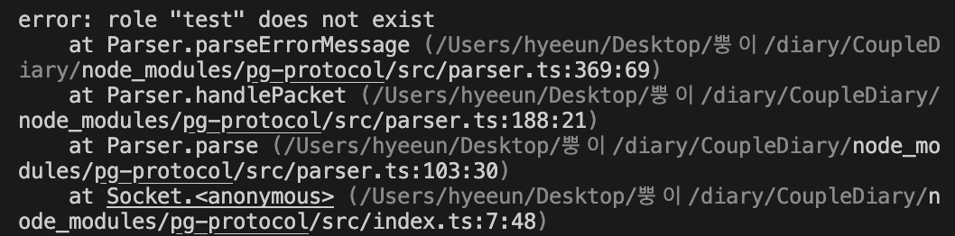 서버를 실행해 보니 위와 같은 에러가 발생했다. 이는 TypeORM의 경우 Database와 연결해 주어야 하는데 DB 설정을 변경하지 않았기 때문에 발생하는 에러이다.