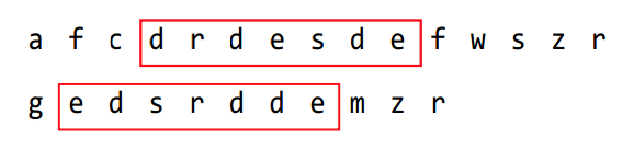 즉 위의 예와 같이 성분이 같은 구간의 길이는 두 서열에서 반드시 같아야 한다. 그리고 같은 성분 의 구간은 하나 이상 존재할 수 있다. 우리는 두 신호 서열에 각각 존재하는 같은 성분 구간 중에 서 가장 긴 것을 찾으려고 한다.