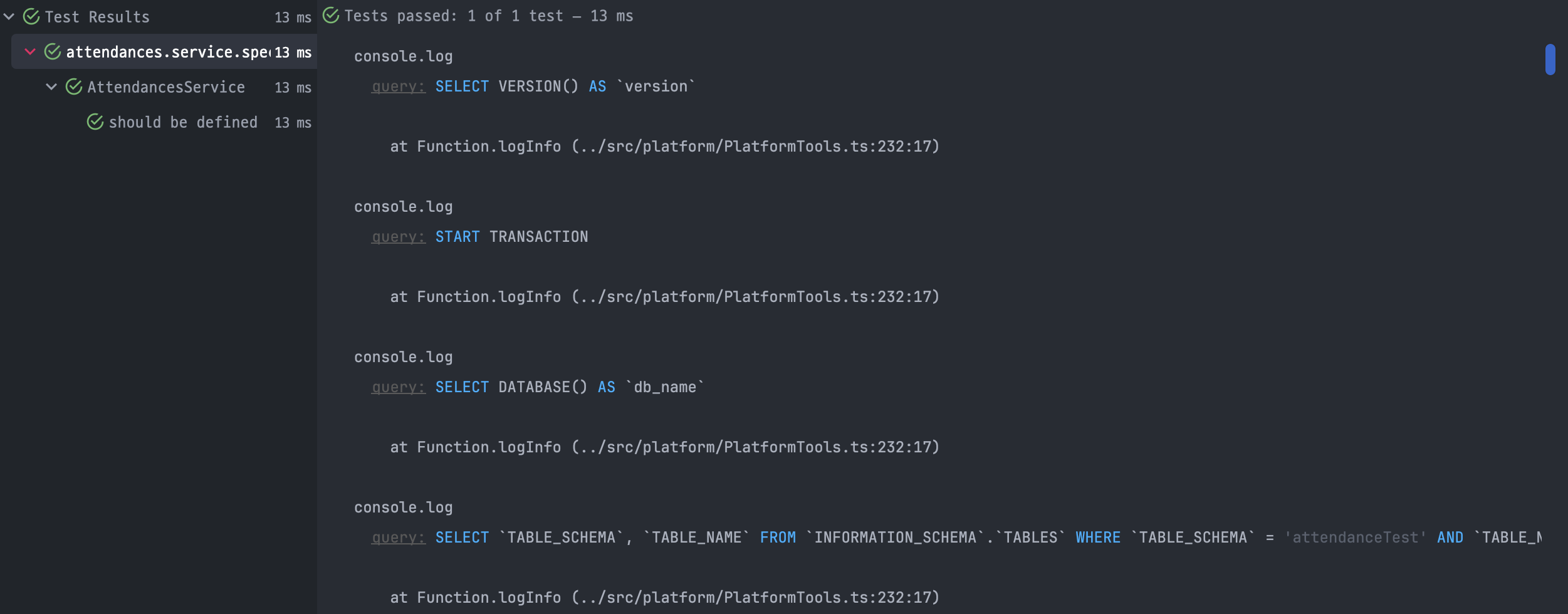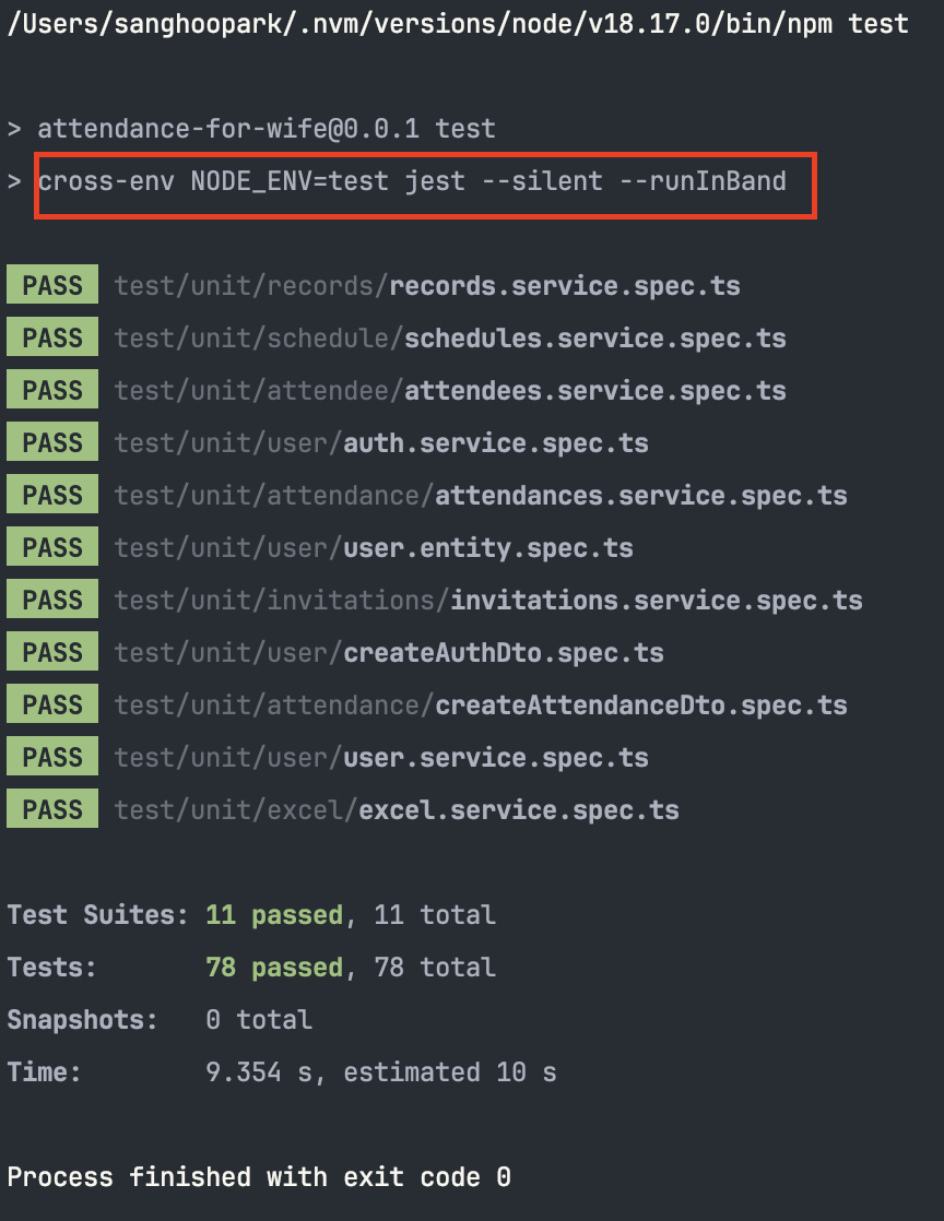 가령 user.service.spec.ts, attendance.service.spec.ts 가 병렬로 실행되면서 서로에게 영향을 미치고 있었던 것이다.