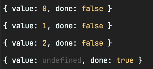 value에는 배열을 반복하면서 값들을 추출하고 있고, 완료여부를 의미하는 done에는 false가 나타납니다.