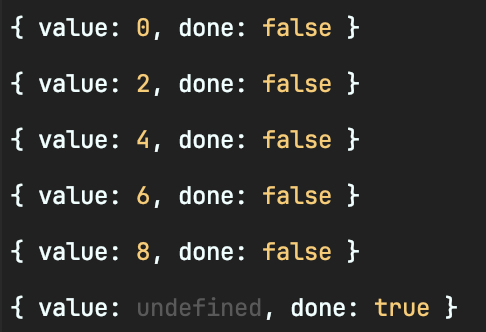 const rangeIterator = range(0, 10, 2)[Symbol.iterator]();