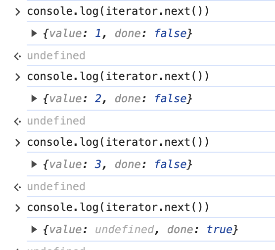 몇 번 반복한 후 배열의 순회를 마치면 value : undefine, done: true 가 나오는 것을 확인할 수 있습니다.