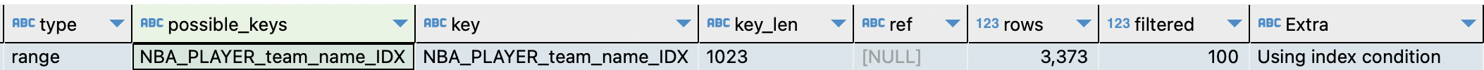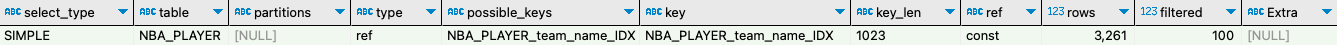 - Using index : Using index는 쿼리 처리가 인덱스만을 사용하여 완료될 수 있음을 나타낸다. 현재 위의 쿼리는 team_name IDX를 사용하는데 SELECT 문에 team_name을 제외한 다른 것을 조회하지 않는다. 그러므로 IDX만으로 쿼리를 처리할 수 있다.