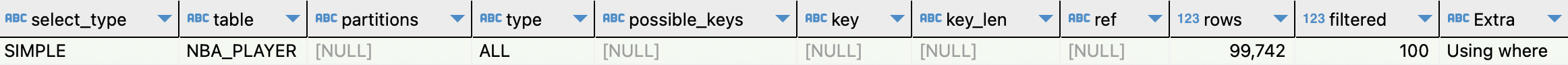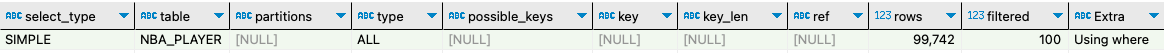 - filtered : 조회한 데이터에서 필터링 되고 남은 퍼센트가 100% 이다 ! 모든 데이터가 다 필요한 것이 아니라 사용된 인덱스가 없기 때문에 모든 데이터를 가지고 온 후 WHERE 절에 맞게 필터링 하기 때문에 filtered 값이 100%로 나왔다.